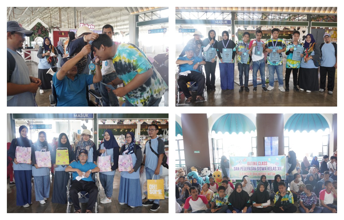 Kemudian peserta didik kelas XII SMALB berjalan ke depan untuk memberikan salam dan ucapan terimakasih kepada bapak/ibu guru yang selama ini telah membimbing mereka. Dan juga, Handik Indarwati, M.Pd. memberikan bingkisan terhadap lima guru yang dirasa memberikan sumbangsih tenaga, pikiran dan loyalitasnya untuk kemajuan sekolah. Terakhir kegiatan pelepasan di tutup dengan menyanyikan lagu terimakasih guruku dan lagu sampai jumpa yang dibawakan oleh Endank Soekamti bersama-sama dilanjut dengan foto bersama. Sebelum memasuki wahana Cimory Dairyland Farm Theme Park Prigen peserta didik yang didampingi wali murid dan guru berbaris rapi dan masuk ke dalam wahana dengan tertib. Dari awal sampai pintu keluar, jepretan camera dari HP tidak pernah berhenti. Banyak spot foto yang sayang untuk dilewatkan. Entah itu foto sendiri, bersama keluarga, bapak/ibu guru, teman sekelas ataupun foto bersama rombongan. Rasa lelah dan capek seakan terbayarkan karena kita dapat mengenal berbagai jenis hewan ternak seperti sapi perah, domba, kambing, kelinci, burung unta, dan lainnya secara langsung. Aktivitas seperti memberi makan hewan dan melihat proses pemerahan susu memberikan pengalaman nyata yang sulit didapat di ruang kelas.